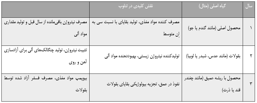 - سال بقولات: تمرکز بر آزادسازی عناصر از طریق مواد آلی و غنیسازی با نیتروژن.