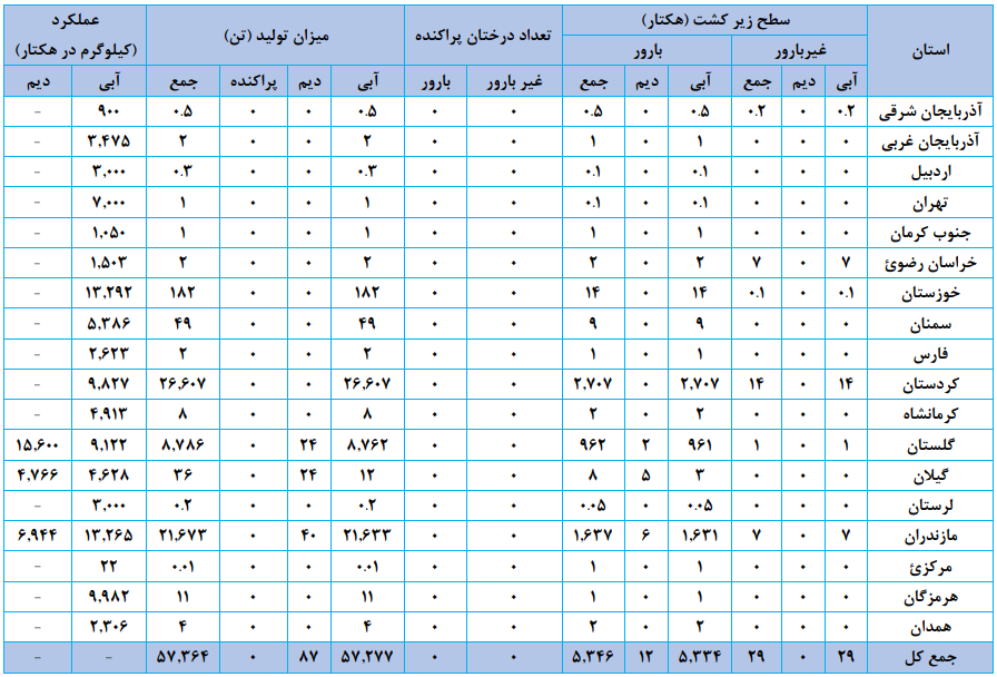 جدول زیر میزان سطح برداشت، تولید و عملکرد در هکتار را در سطح کشور نشان میدهد.